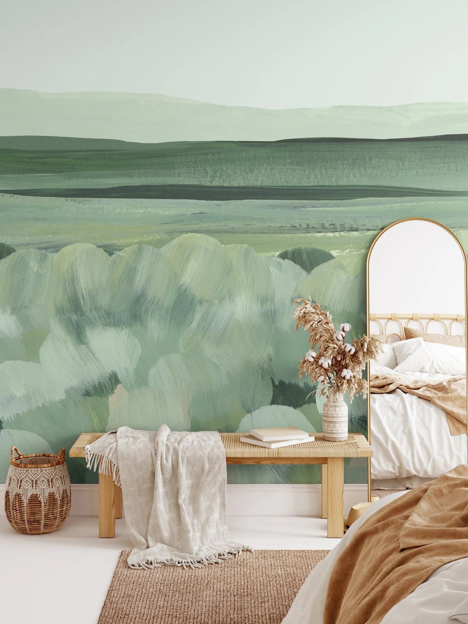 Like stepping into a painted dream, this (easy hang wallpaper) landscape mural brings soft green hills and layered brushstrokes to your space. The wall mural design feels both artistic and grounded—perfect for those who want their walls to feel more like a canvas than a backdrop.