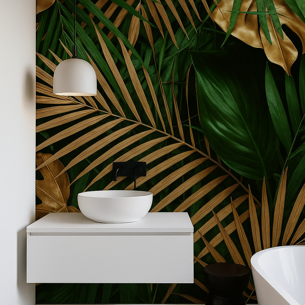 Make a bold statement in your bathroom with this sophisticated botanical wallpaper featuring a striking mix of lush green leaves and golden palm fronds. The high-contrast palette creates a rich, immersive backdrop that elevates minimalist fixtures and adds depth to the space. Paired with sleek white surfaces, matte black accents, and modern lighting, this mural transforms the room into a nature-inspired retreat—perfect for creating a luxurious and relaxing ambiance with an exotic twist.