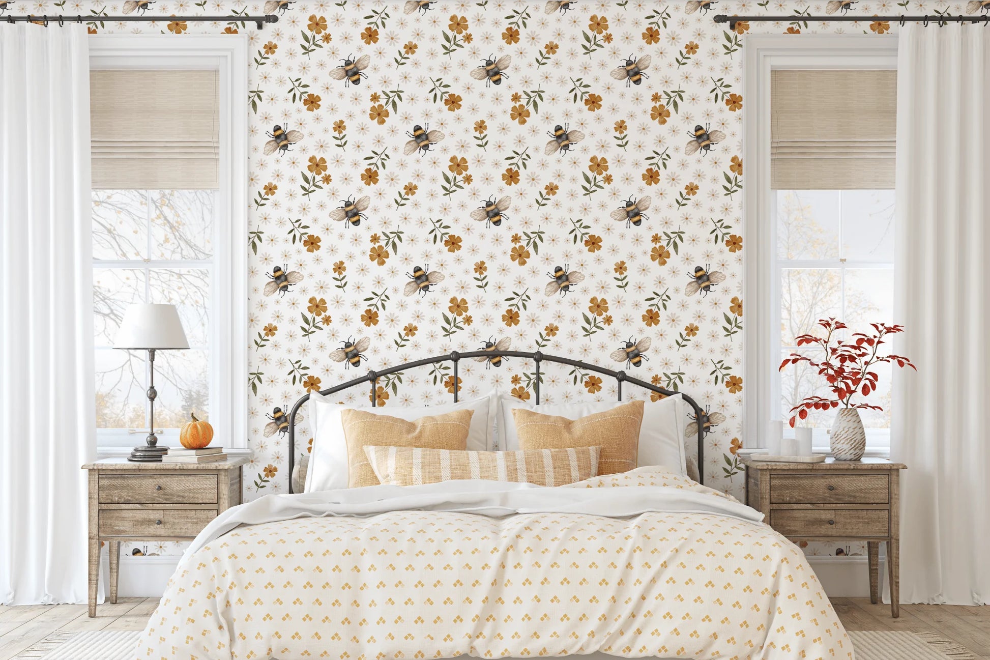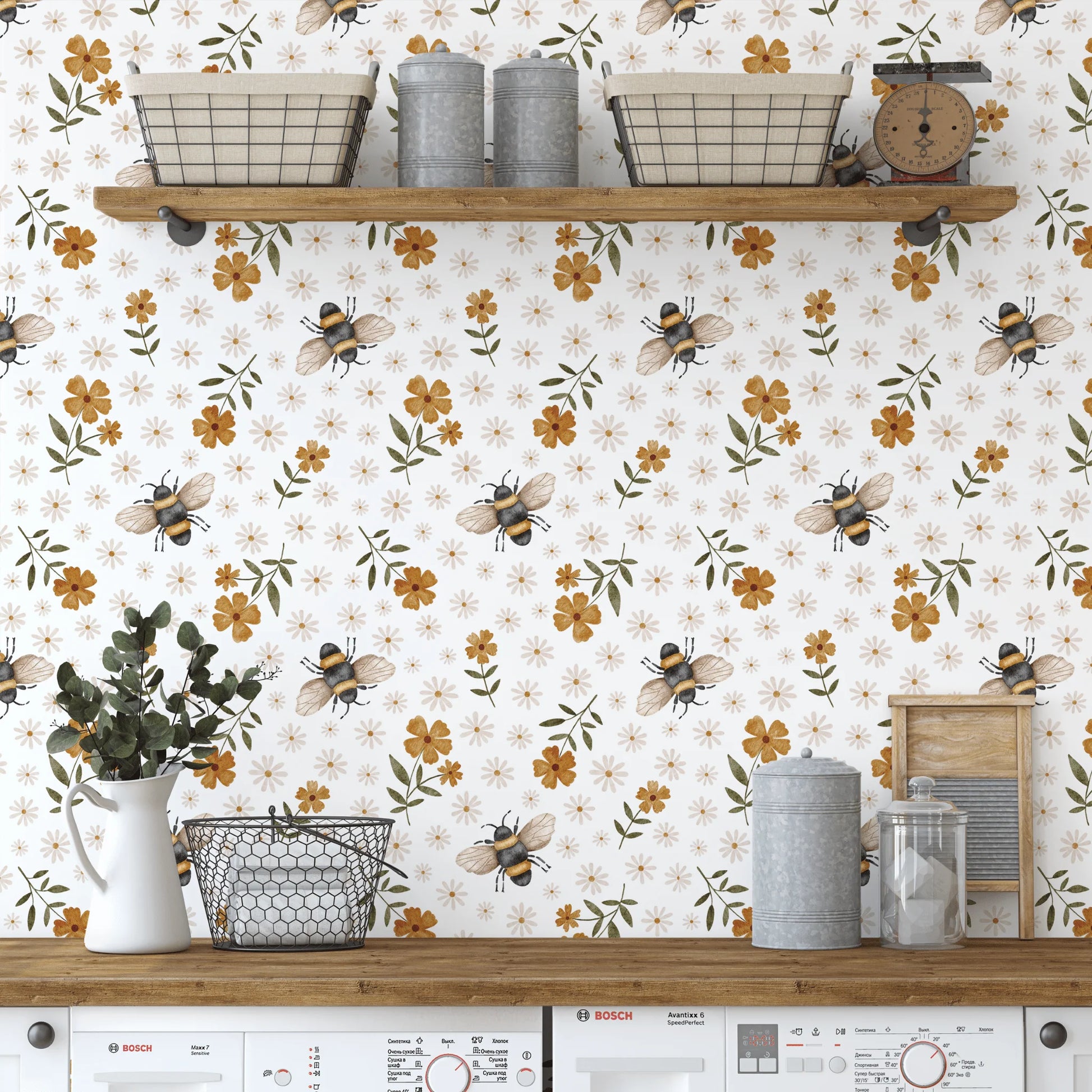 Bring a touch of nature indoors with this charming bee wallpaper, featuring delicate bumblebees, wildflowers, and vintage-inspired florals. Available in peel and stick or traditional unpasted options, this design is perfect for laundry rooms, kitchens, nurseries, and cozy cottage core spaces.