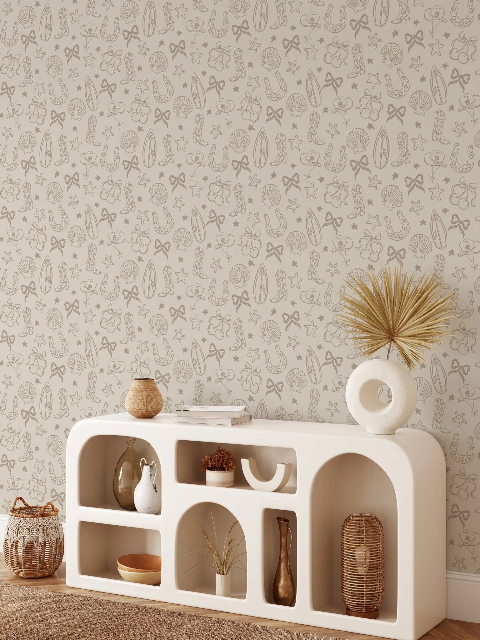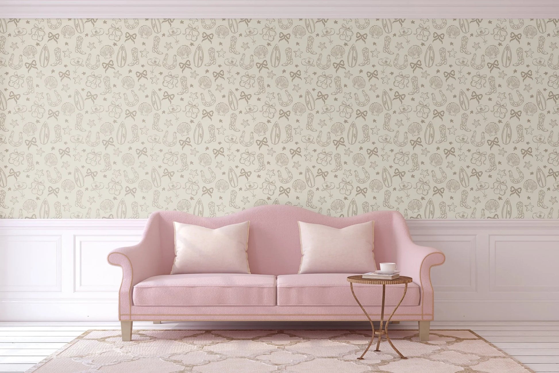 The Coastal Cowgirl Peel and Stick Wallpaper (Neutral Brown) features images of cowboy boots, bows/ribbons, cherries, surfboards, and other iconic elements of the coastal cowgirl aesthetic.