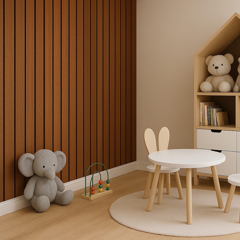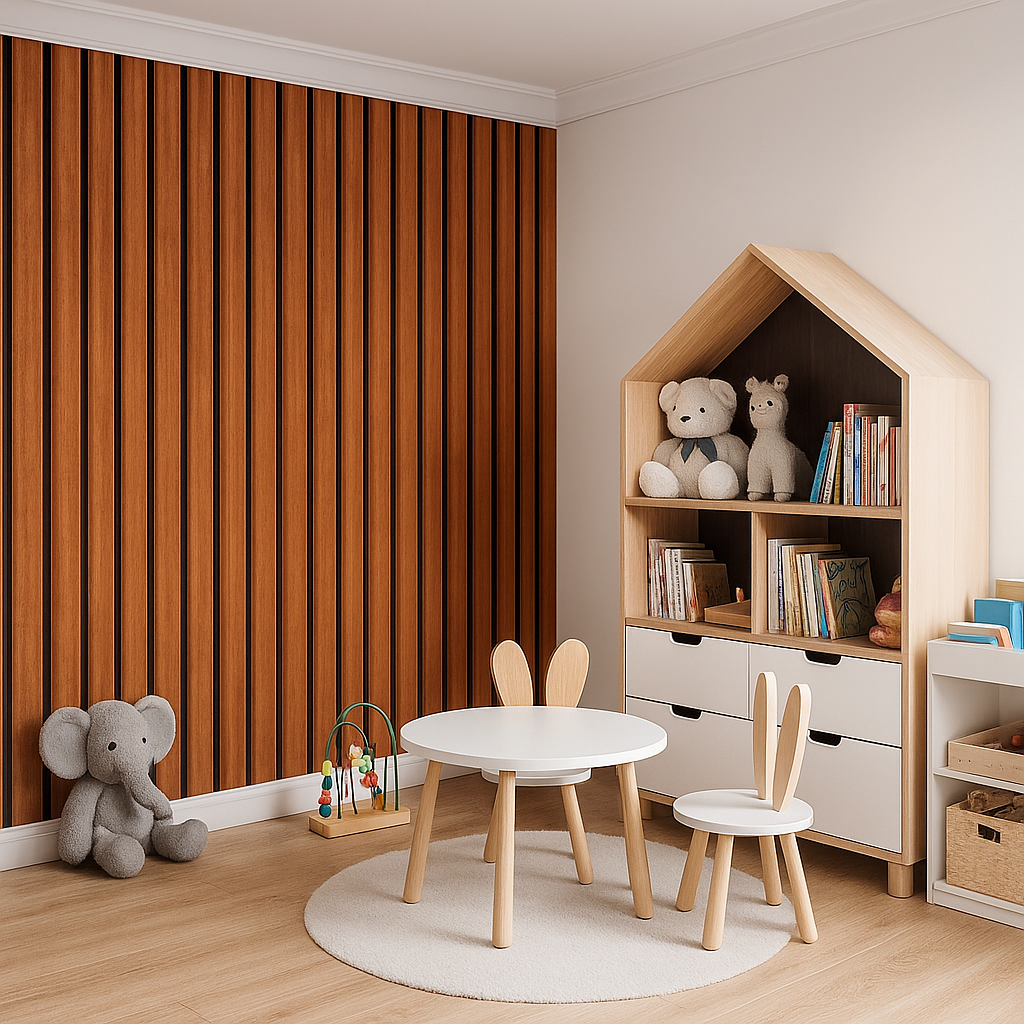 This charming playroom corner blends warmth and functionality with soft wood accents, a slatted feature wall, and adorable details.