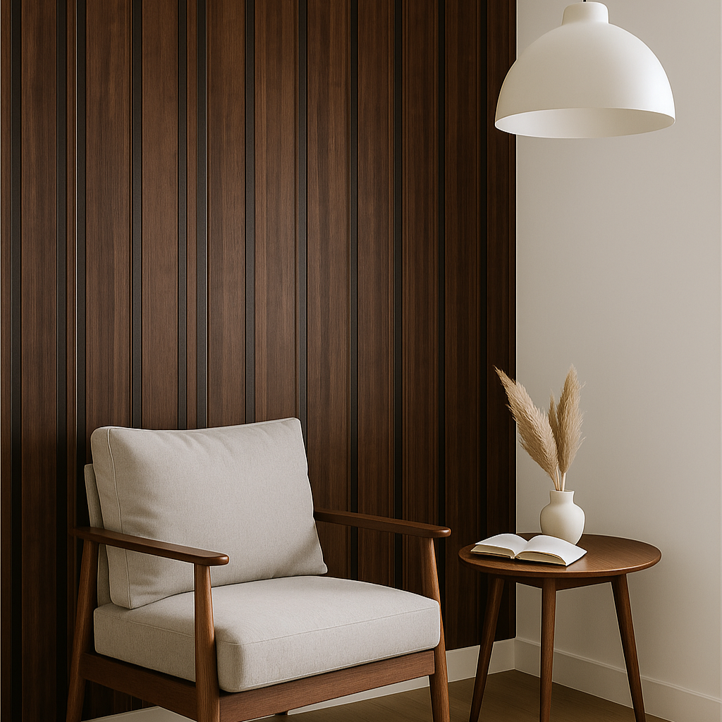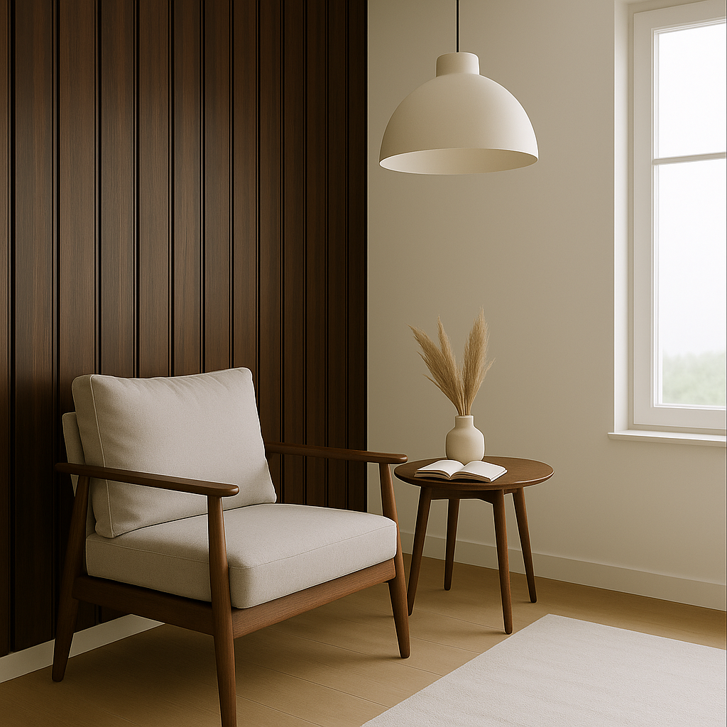 Immerse yourself in calm and focus with this beautifully designed reading nook, enhanced by a rich dark wood vertical panel wallpaper. The deep chocolate tones and subtle black accents create an inviting atmosphere, perfect for curling up with your favorite book. Paired with a mid-century modern armchair and a minimalist round table, the space achieves a harmonious balance between elegance and simplicity. This wallpaper adds both texture and depth, making it ideal for corners where you want to define a purpose without clutter. A stylish pendant light and natural decorative touches complete the look, turning any unused corner into your new favorite retreat.