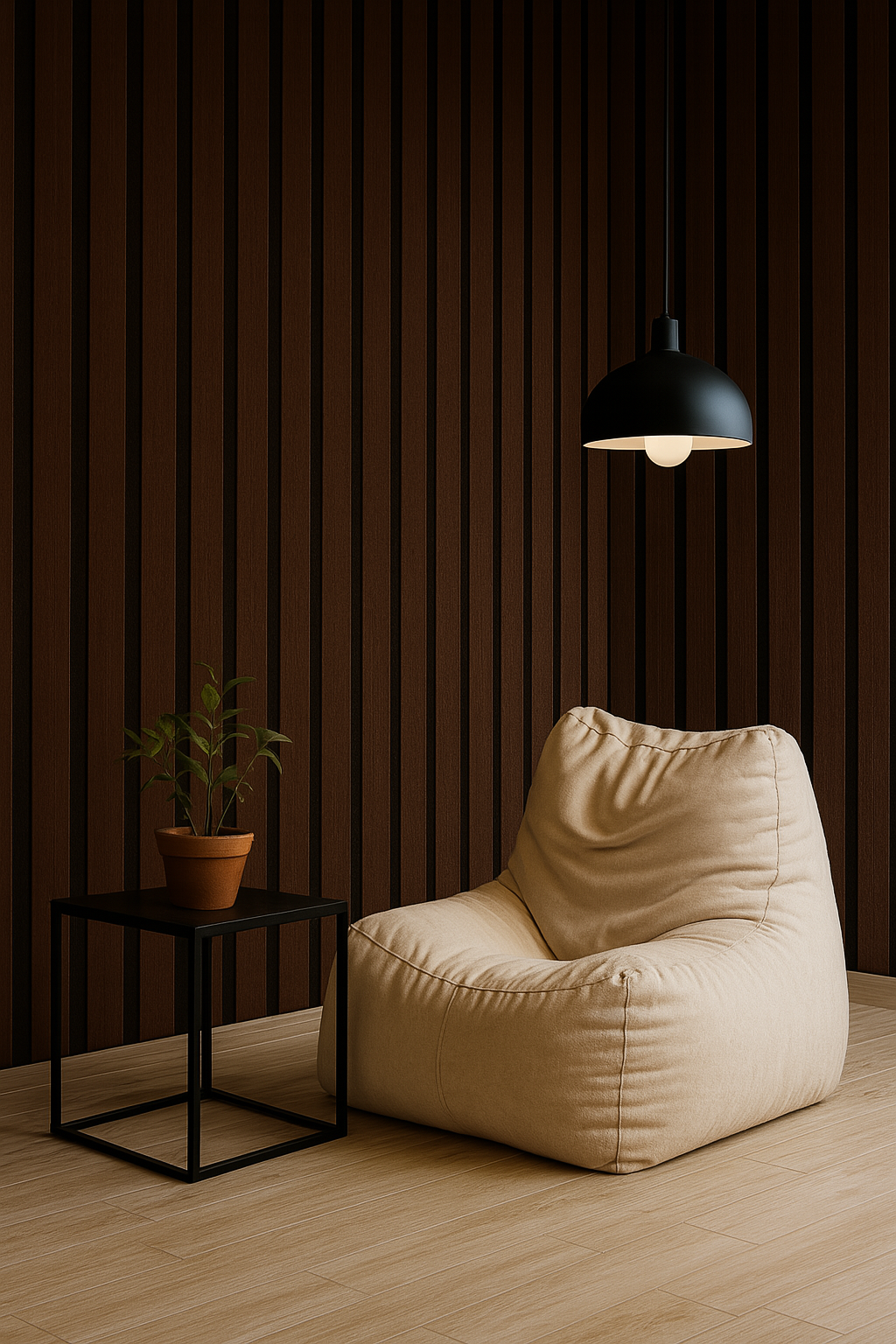 Bring warmth and sophistication to your space with this dark brown vertical slat wallpaper. Featuring rich wood tones and deep black grooves, it creates a modern yet cozy ambiance — perfect for reading corners, studios, or minimalist interiors. The subtle texture and vertical lines help visually expand the room, making it both stylish and inviting.
