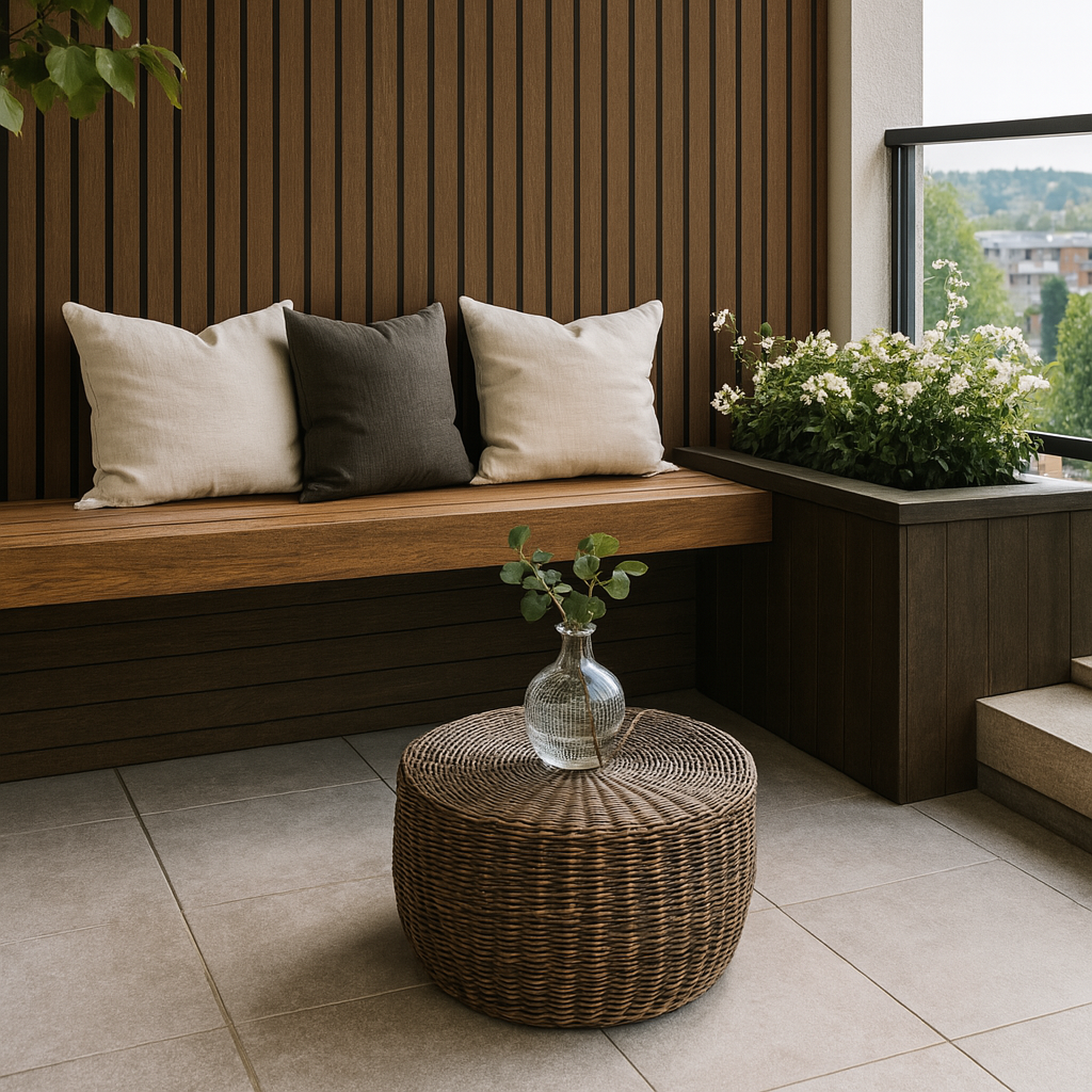 This wallpaper features espresso-toned vertical slats with a subtle woodgrain texture, ideal for creating cozy and modern environments. Perfect for terraces, balconies, or interior accent walls, its deep color adds warmth and contrast while maintaining a clean, minimalist look. Pairs beautifully with neutral furniture, greenery, and natural lighting.