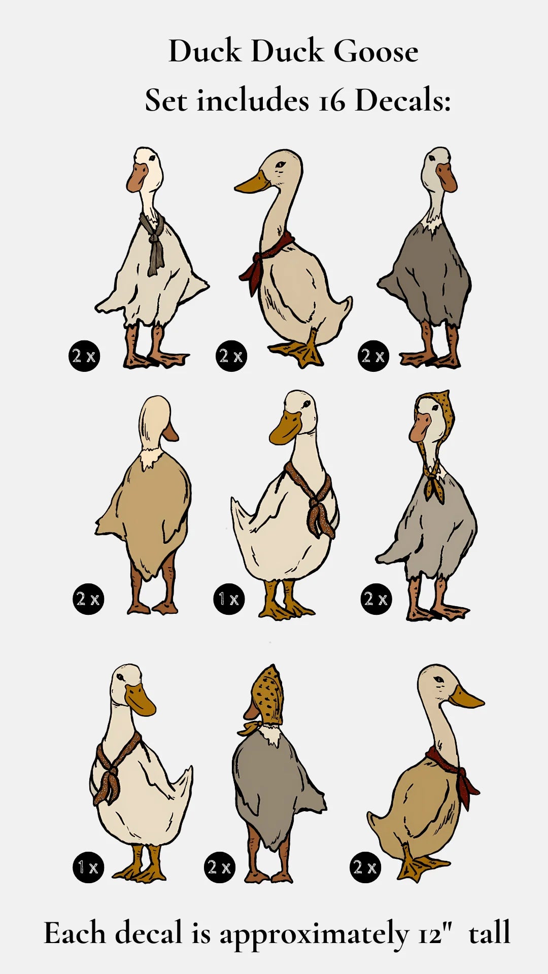 - A full sheet of our Duck Duck Goose decals includes sixteen varying ducks, all approximately 12" tall.