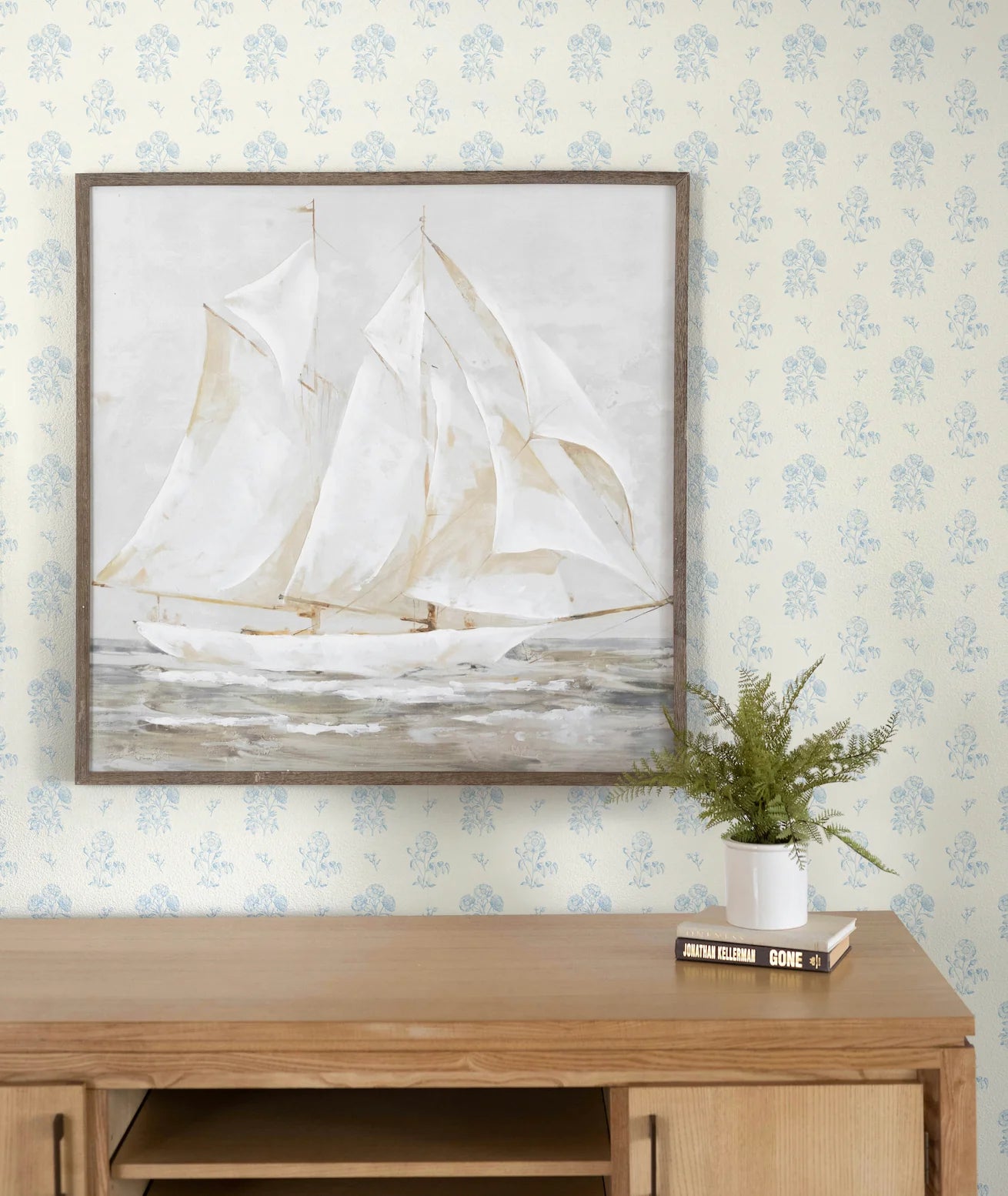This removable wallpaper design adds a gentle elegance to any room. With dainty blue blooms (in robin egg blue) set against a warm cream background, it’s an easy way to bring that cozy, collected Cotswolds look into your home.