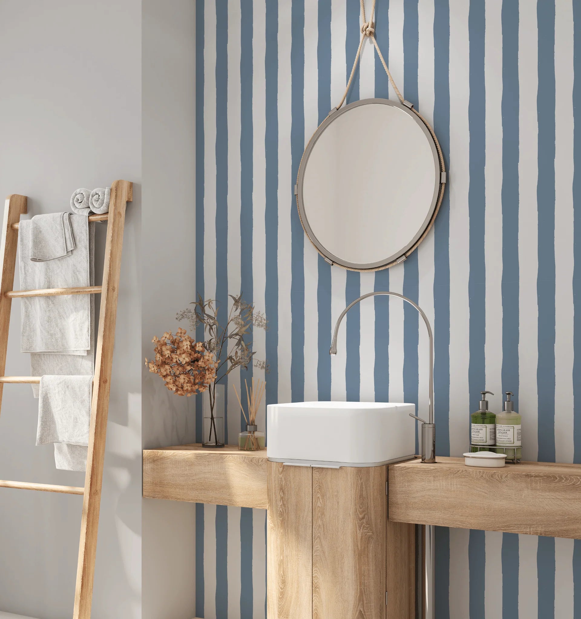 Featuring hand-drawn, painterly stripes in a rich, muted blue, this design adds visual interest without feeling rigid or formal.