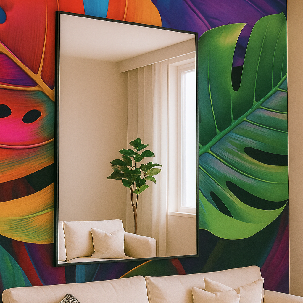 Perfect for a mirror accent wall in a contemporary living room, the bold palette reflects light and mood, enhancing both the visual depth and the vibrancy of your decor. Pair it with minimalist mirrors, clean lines, and neutral furnishings for a striking balance between tropical intensity and modern elegance.