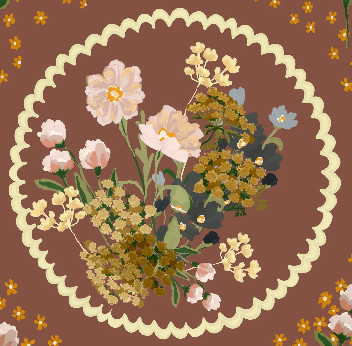 This removable wallpaper features a vibrant floral bouquet pattern with various flowers in shades of pink, yellow, green, and blue against a rich burgundy background within a scallop border. The antique feel is reminiscent of Grandma's wallpaper.. and what's not to love about Grandma!