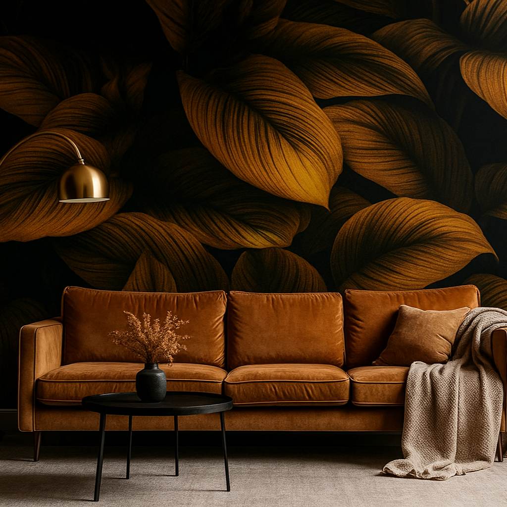 Dramatic and refined, this golden botanical wallpaper sets the stage for a luxurious living space. With sweeping leaves in rich golden hues against a deep black background, the design creates both warmth and bold contrast. Perfectly paired with a velvet camel-toned sofa, brass accents, and soft textiles, the space feels modern yet timeless. Ideal for feature walls in living rooms or lounges, this mural adds depth, style, and a hint of opulence to any interior.