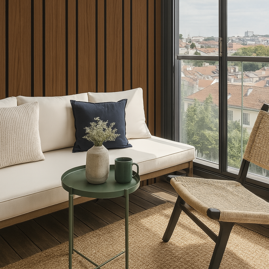 This wallpaper showcases a soft oak woodgrain pattern with sleek black vertical stripes, perfect for bright, contemporary interiors. Its clean and balanced design brings warmth and texture to living rooms, sunrooms, or balconies, pairing especially well with light-colored furniture, greenery, and large windows for an airy and relaxed atmosphere.