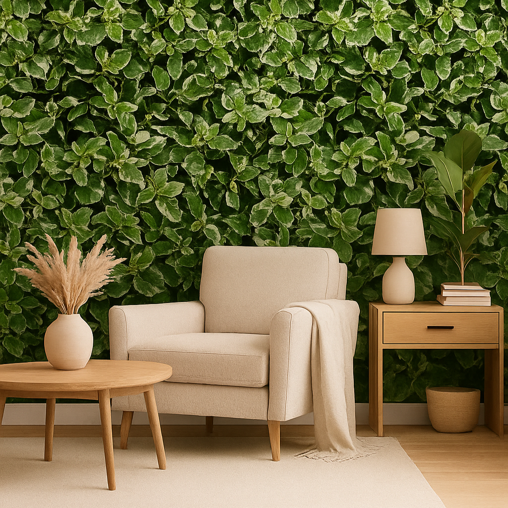This vibrant botanical wallpaper features lush, variegated green foliage with a delicate mix of light and dark tones. The leaves are densely layered, creating a fresh and natural texture that brings the feeling of a lively garden indoors. Perfect for accent walls or full-room coverage, this design adds depth and organic beauty to any space. It’s ideal for those looking to infuse their interiors with a touch of nature, enhancing relaxation and visual interest through a realistic, nature-inspired pattern.
