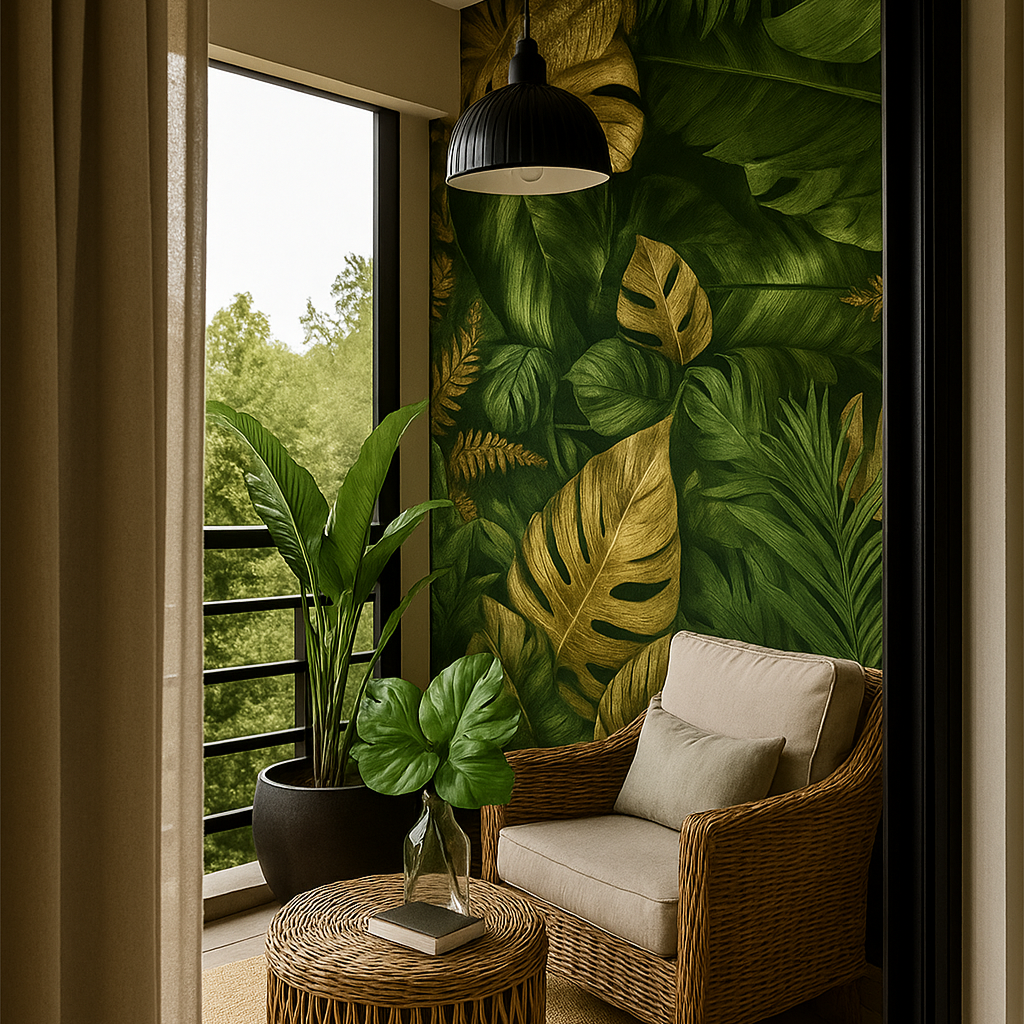 Turn your balcony into a tropical hideaway with this vibrant wallpaper featuring oversized botanical leaves in rich tones of green and golden ochre. The lush design brings the beauty of the jungle into your home, creating an energizing yet relaxing atmosphere perfect for morning coffee, reading, or simply unwinding. Paired with woven textures, potted plants, and natural fiber rugs, the space becomes a seamless extension of nature with a cozy, curated feel. Ideal for small outdoor spaces in need of personality and warmth.