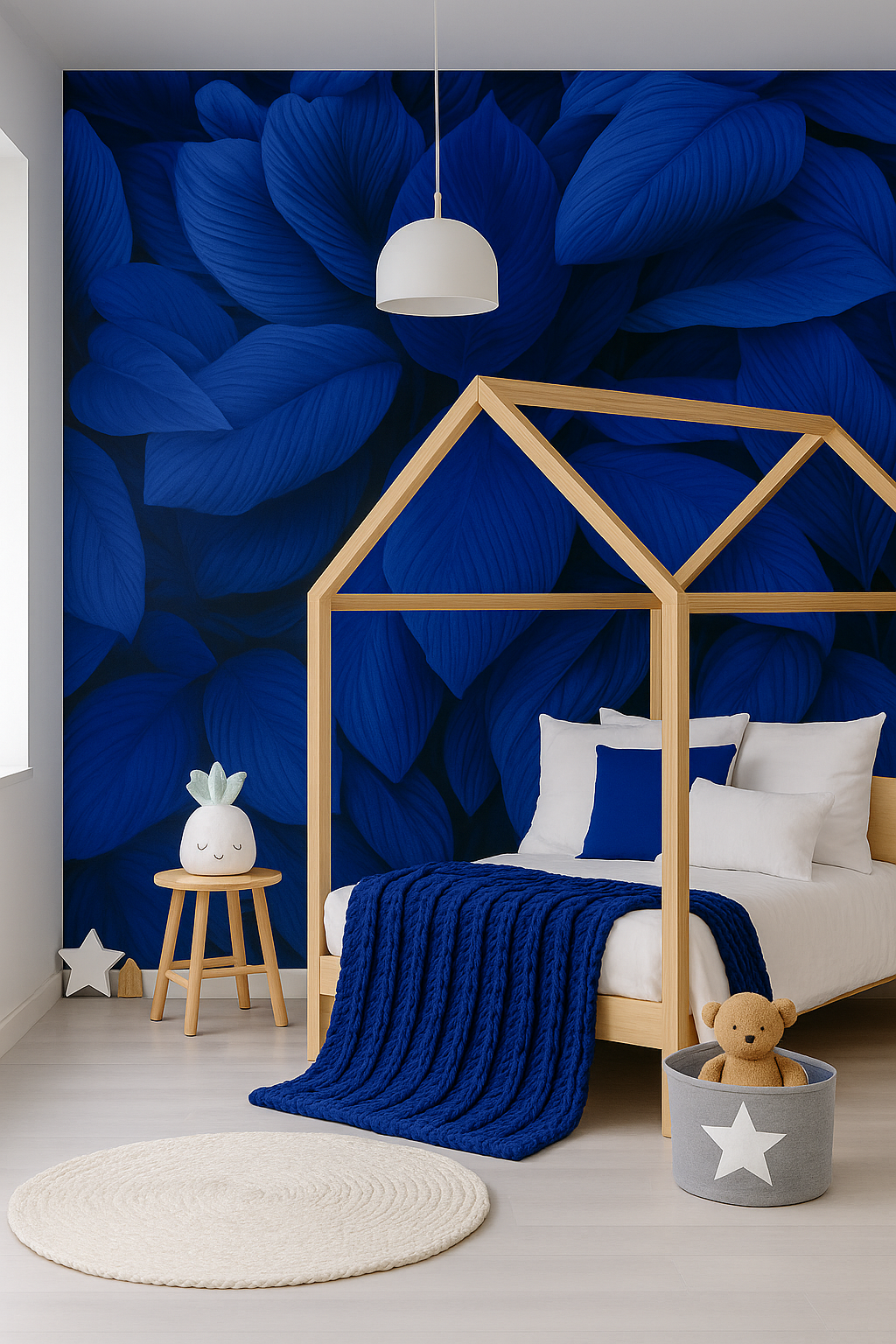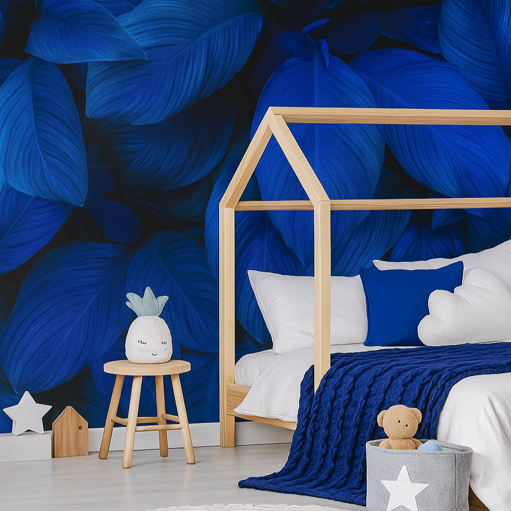 Transform a child's room into a dreamy oasis with this bold and vibrant botanical wallpaper in deep cobalt blue. The oversized leaf pattern adds depth and texture while creating a magical jungle atmosphere that sparks imagination and calm. Perfectly paired with a minimalist wooden bed frame, soft white bedding, and playful accents, this design strikes the ideal balance between adventure and serenity. Ideal for kids’ bedrooms or creative play areas, it offers a stylish backdrop that grows with your child.