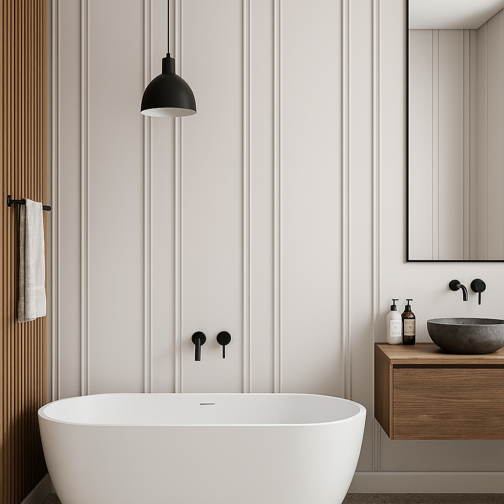 Add timeless elegance to bathrooms or living spaces with the Modern Light Ivory Vertical Panel Wallpaper. Its clean vertical grooves and soft ivory tone create a refined, spa-like atmosphere, ideal for pairing with minimalist fixtures and natural textures. Water-resistant and easy to maintain, perfect for contemporary interiors.