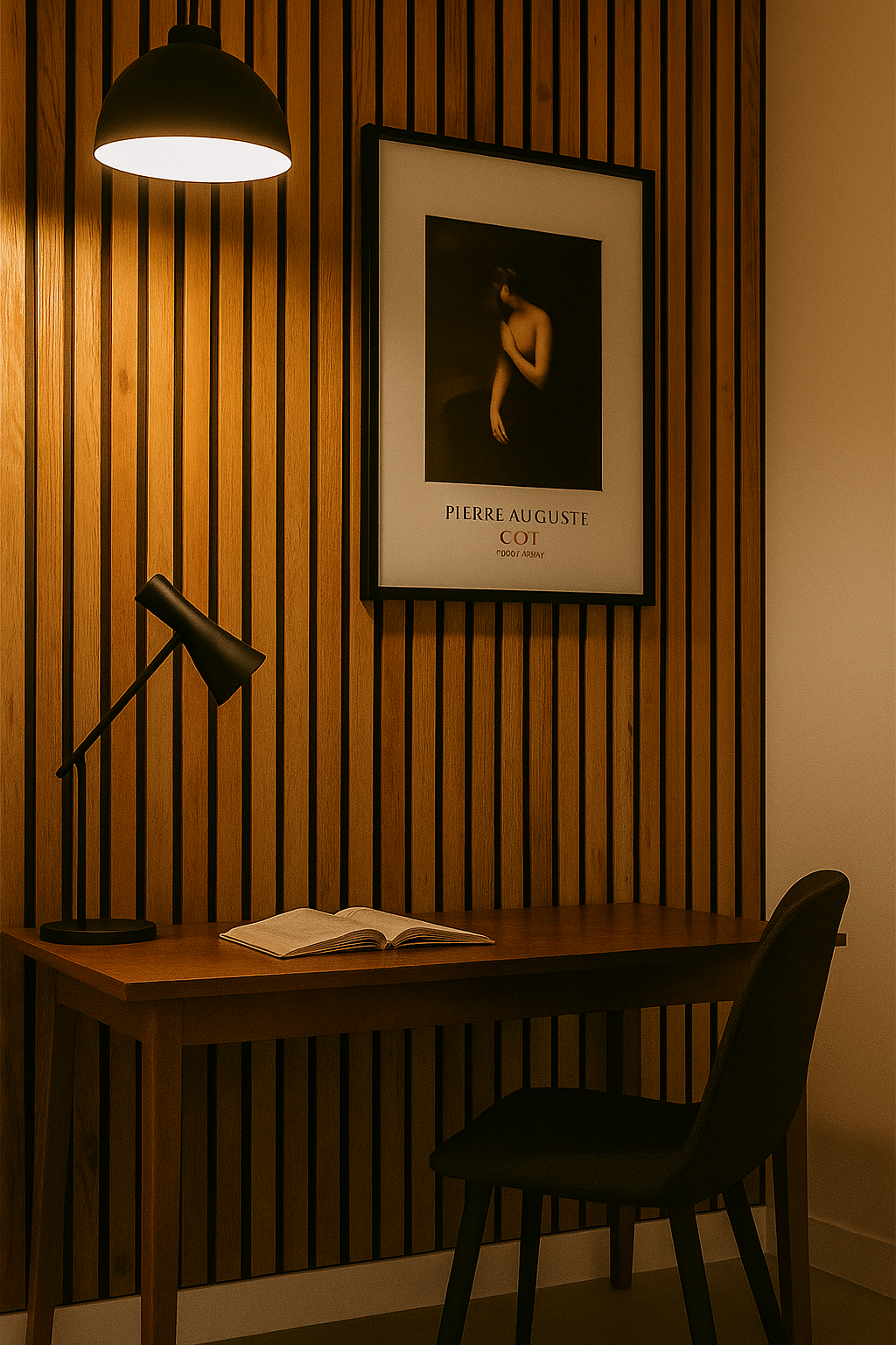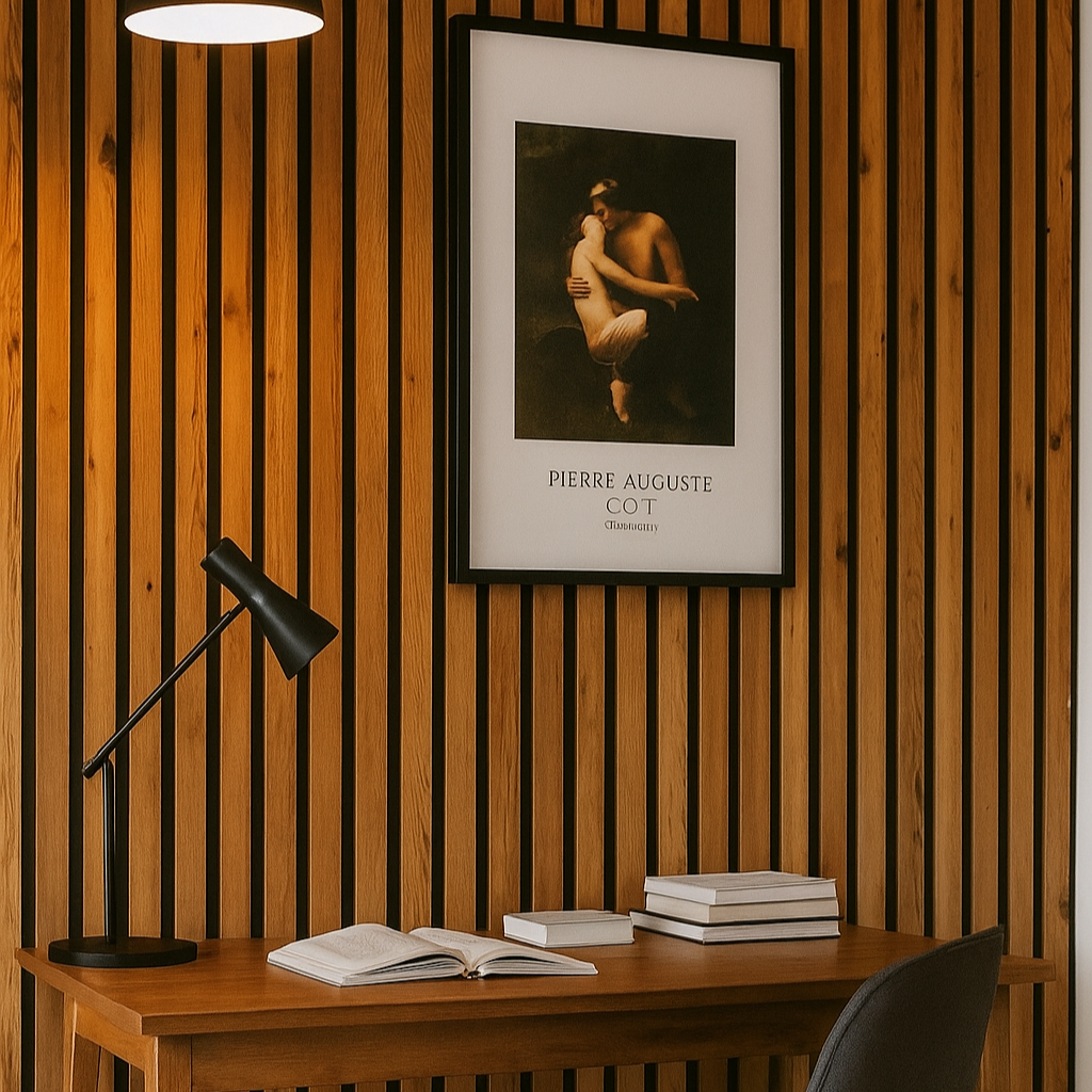 This sophisticated study corner brings together the timeless beauty of natural wood slats and functional design. The vertical paneling adds depth and rhythm to the space, while the classic Pierre Auguste Cot artwork and minimalist furnishings evoke a quiet elegance. Perfect for work or reflection, this cozy nook combines clean lines, warm lighting, and a sleek black lamp for a touch of modern refinement. Ideal for those who value tranquility and taste in their home workspace.
