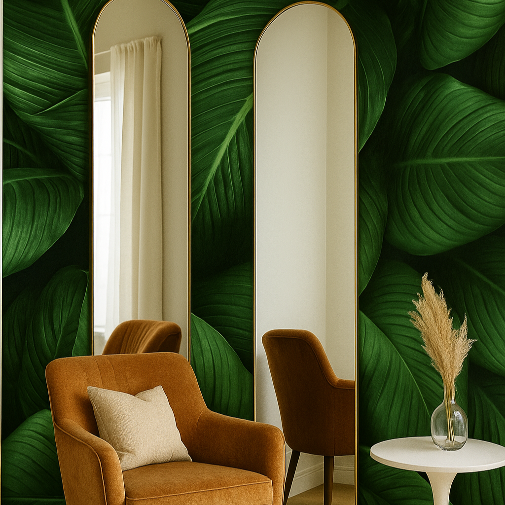 Step into a serene corner of nature with this bold tropical leaf wallpaper. Designed to create a calming and elegant atmosphere, the large-scale green foliage brings depth and texture to any space—perfect for reading nooks, dressing areas, or cozy lounges. The richly layered leaves with natural shading evoke the feeling of being surrounded by a lush forest, while pairing effortlessly with warm earth-toned furniture, neutral textiles, and minimalist décor. Whether used as a statement wall or to define a peaceful space, this mural transforms interiors into a sophisticated and nature-inspired haven.