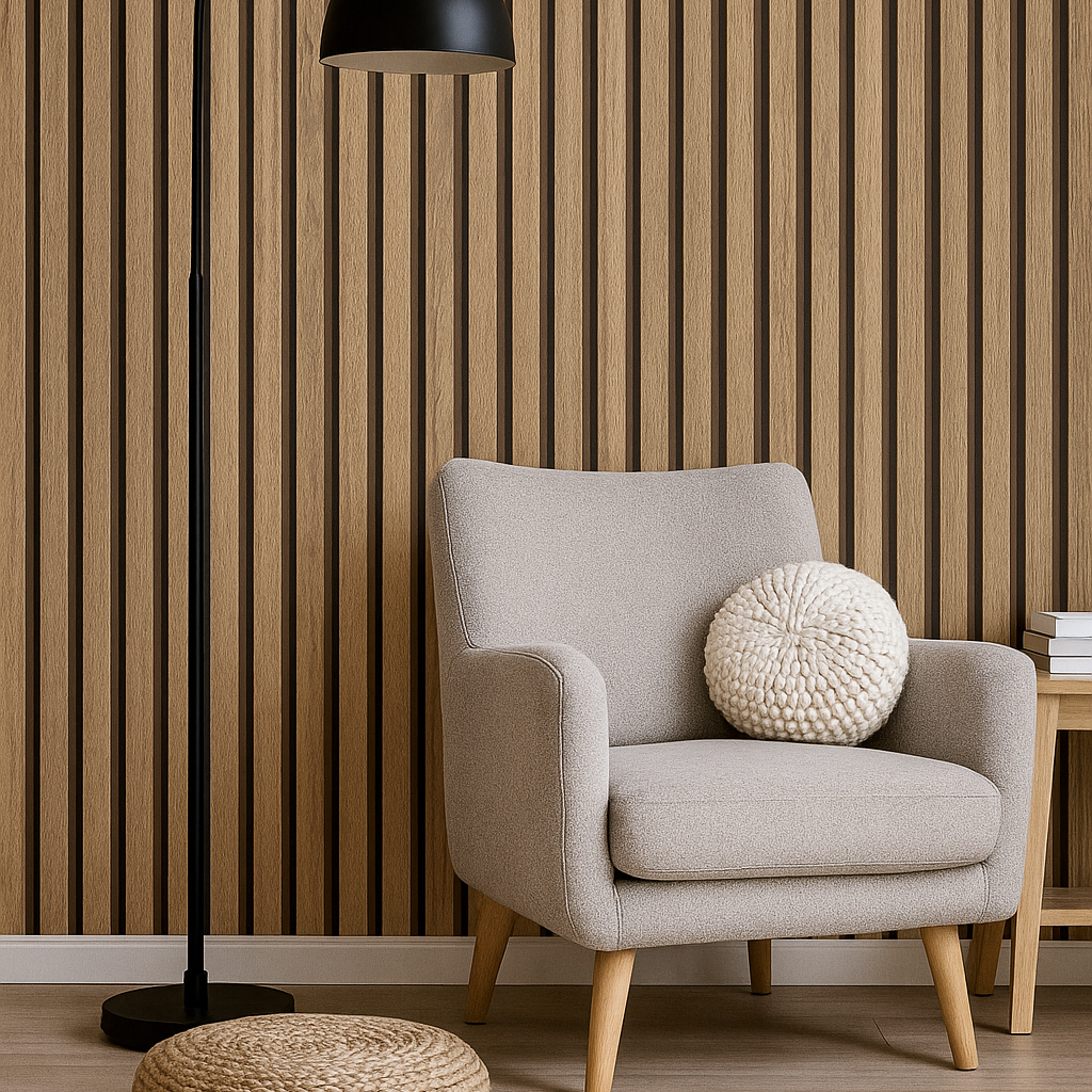 Create a warm and calming atmosphere in your reading nook with this Scandinavian-inspired wood slat wallpaper.