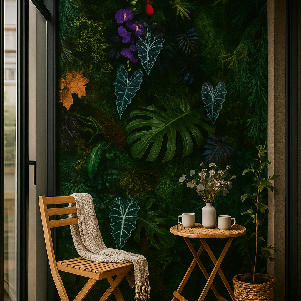 Transform your balcony or cozy corner into an enchanted retreat with our “Secret Garden” wallpaper. This design blends deep forest foliage with vivid highlights of exotic leaves and wildflowers, creating a magical, immersive space full of charm and depth.