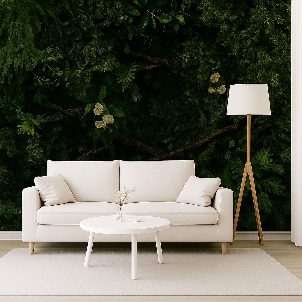 Immerse your space in the depth and tranquility of nature with our “Silent Forest” wallpaper. This highly realistic design mimics a wall covered in lush greenery, branches, and deep green leaves, creating a serene and sophisticated atmosphere.