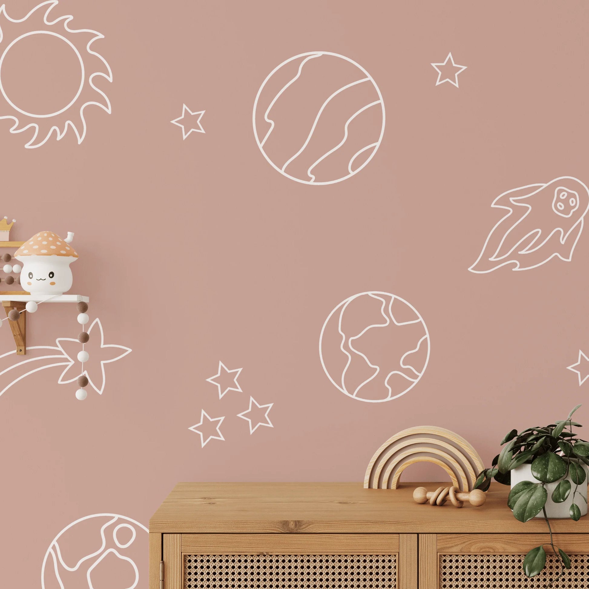 Our Simple Space Decals bring a sprinkle of cosmic charm to your little one’s room. These outlined decals include a mix of planets, stars, moons, comets, and more, giving you plenty to work with for a custom galaxy wall.