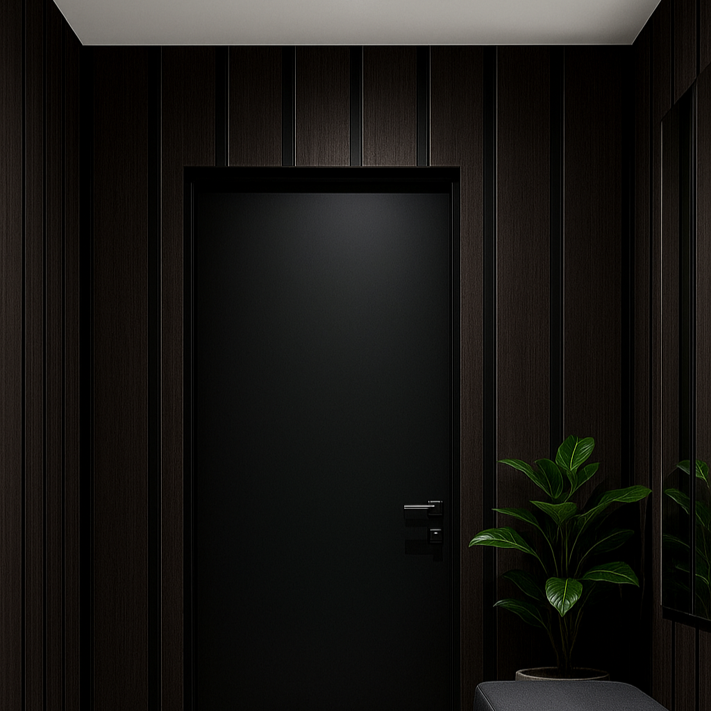 This sleek and elegant entryway features a matte black door framed by dark vertical wood panels, creating a bold and dramatic statement.