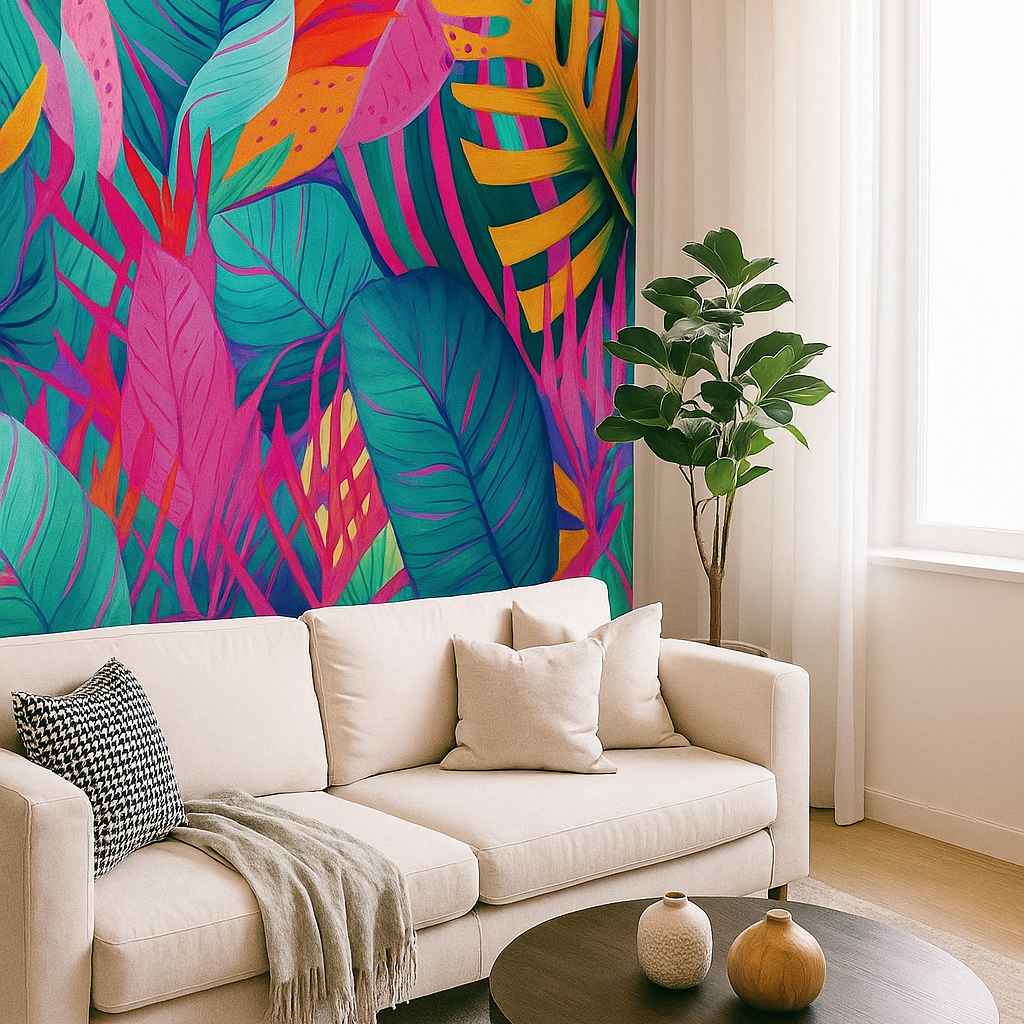 Infuse your living space with vibrant energy and a sense of escape using this bold tropical wallpaper. Featuring oversized leaves in electric shades of teal, magenta, orange, and green, the mural creates a dynamic focal point that brings life and movement into the room. Perfectly balanced with neutral furnishings and natural light, this design is ideal for modern interiors that embrace personality, color, and a touch of the exotic. Whether in a living room or creative space, it transforms the ambiance into a lively tropical retreat.