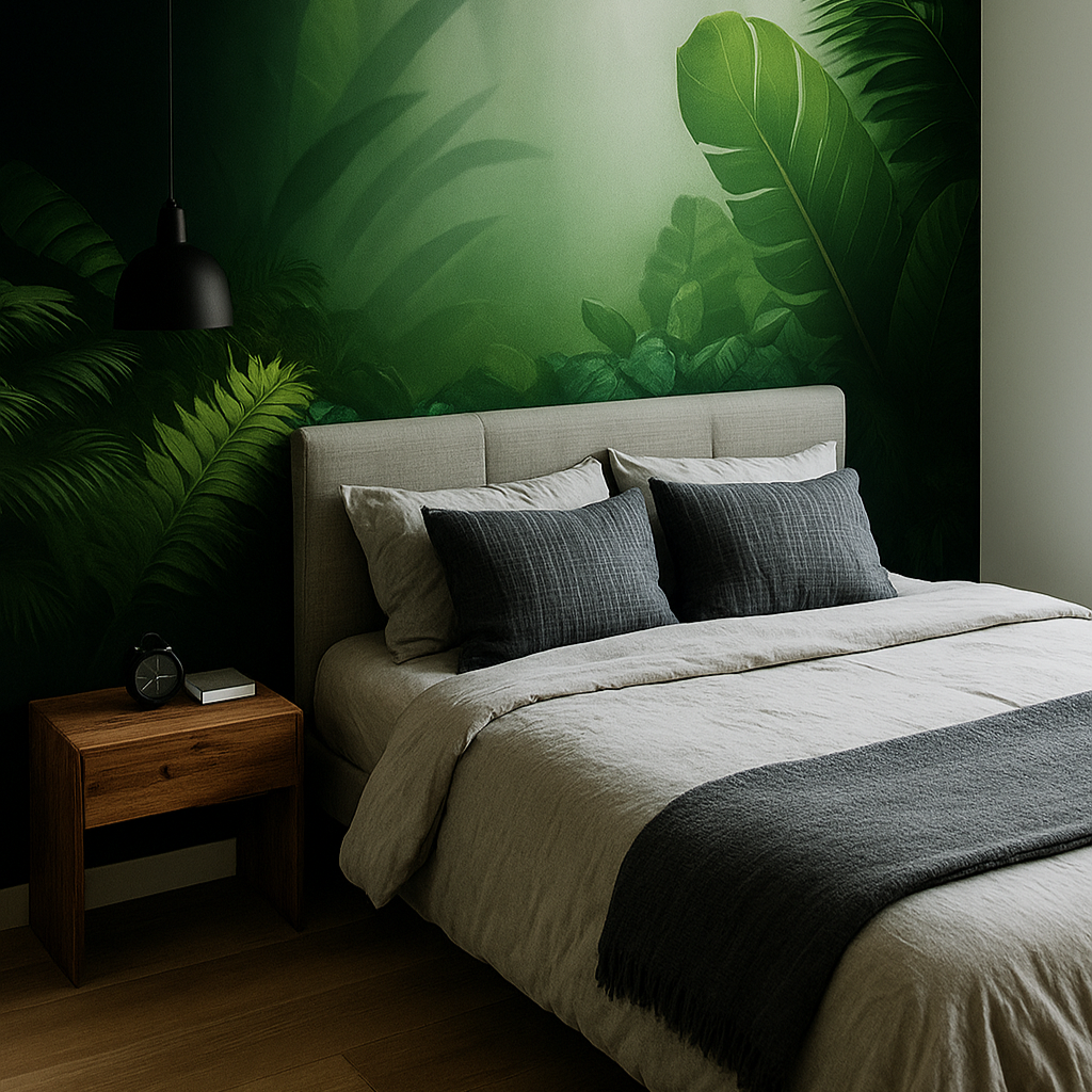Immerse yourself in the tranquil beauty of the rainforest with this breathtaking mural wallpaper, designed to transform your bedroom into a serene jungle retreat. Featuring layered palm leaves, banana fronds, and soft gradients of green that mimic light filtering through the canopy, this design adds depth, warmth, and a calming ambiance to any modern interior. Perfectly paired with minimalist bedding and dark accents, the mural creates a natural focal point without overwhelming the space. Ideal for those seeking a relaxing sanctuary that evokes nature, serenity, and subtle sophistication.