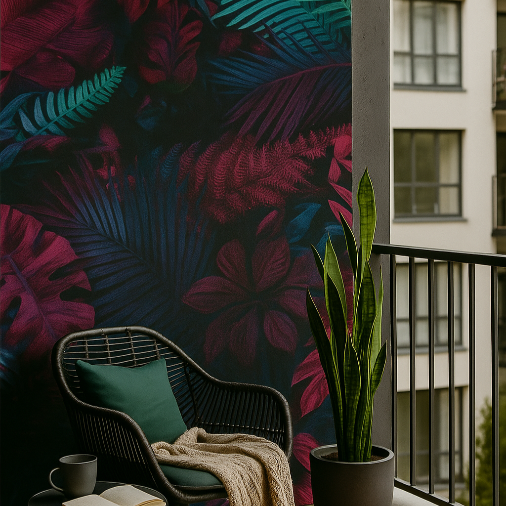 Transform your balcony into a lush retreat with this dramatic tropical wallpaper featuring deep tones of emerald, burgundy, and violet.