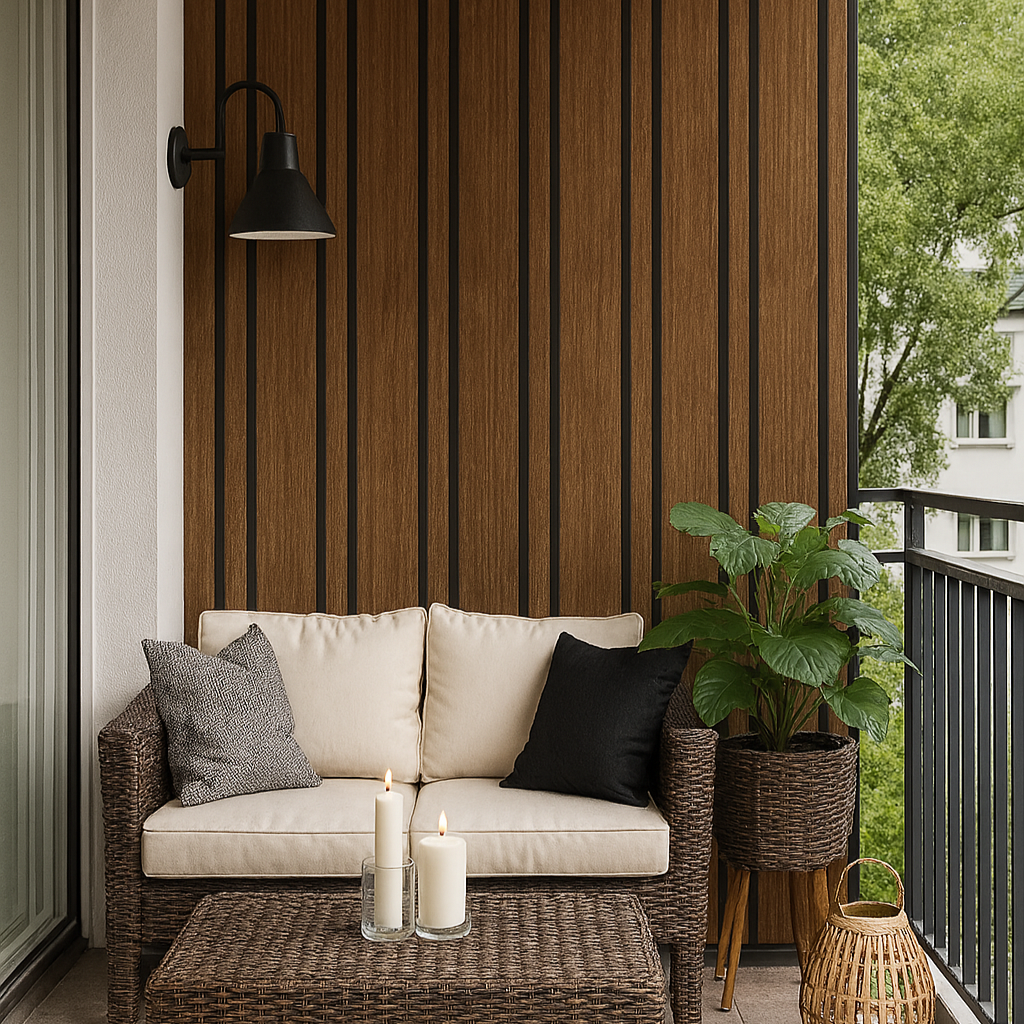 This wallpaper showcases dark espresso vertical slats with a fine woodgrain texture, perfect for adding depth and elegance to balconies, terraces, or indoor reading nooks. Its rich color and slim vertical lines create a visually elongating effect while providing a warm, inviting backdrop for minimalist or natural decor. Ideal for combining with neutral cushions, woven textures, and greenery.