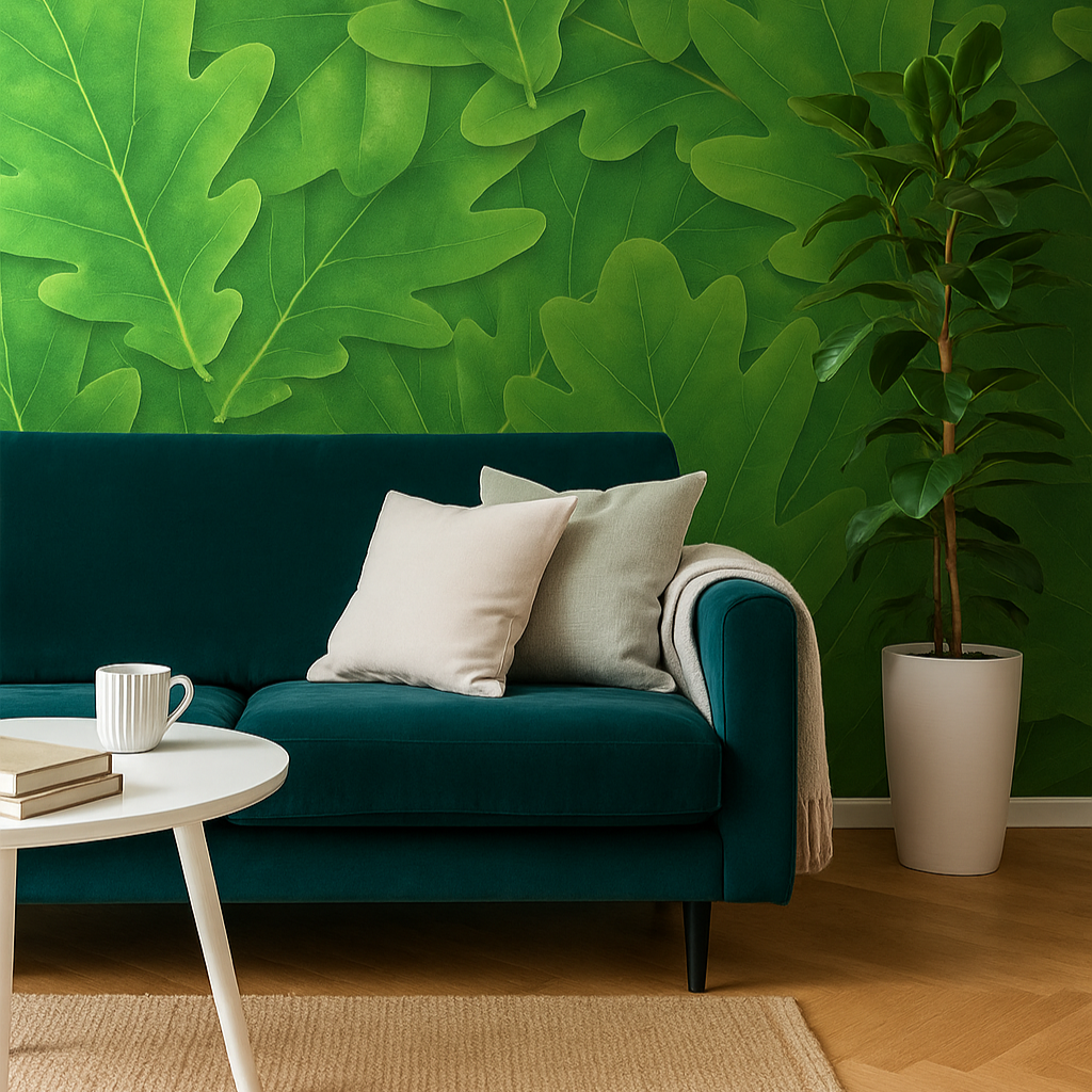 Inspired by dense forests and Scandinavian aesthetics, this wallpaper is ideal for those seeking a space that radiates life, calm, and natural beauty. The large-scale leaves, with their soft detailing and flowing forms, create depth and visual movement without overwhelming the room.