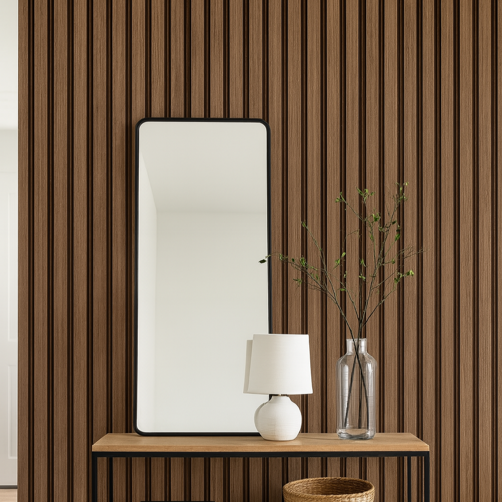 This wallpaper showcases soft walnut woodgrain vertical slats with slim black accents, perfect for creating a warm and inviting atmosphere in hallways, entryways, or living spaces. Its natural tone enhances light and neutral decor, blending easily with black metal details, mirrors, and minimalist furniture. Ideal for modern homes looking for a balanced mix of texture and simplicity.