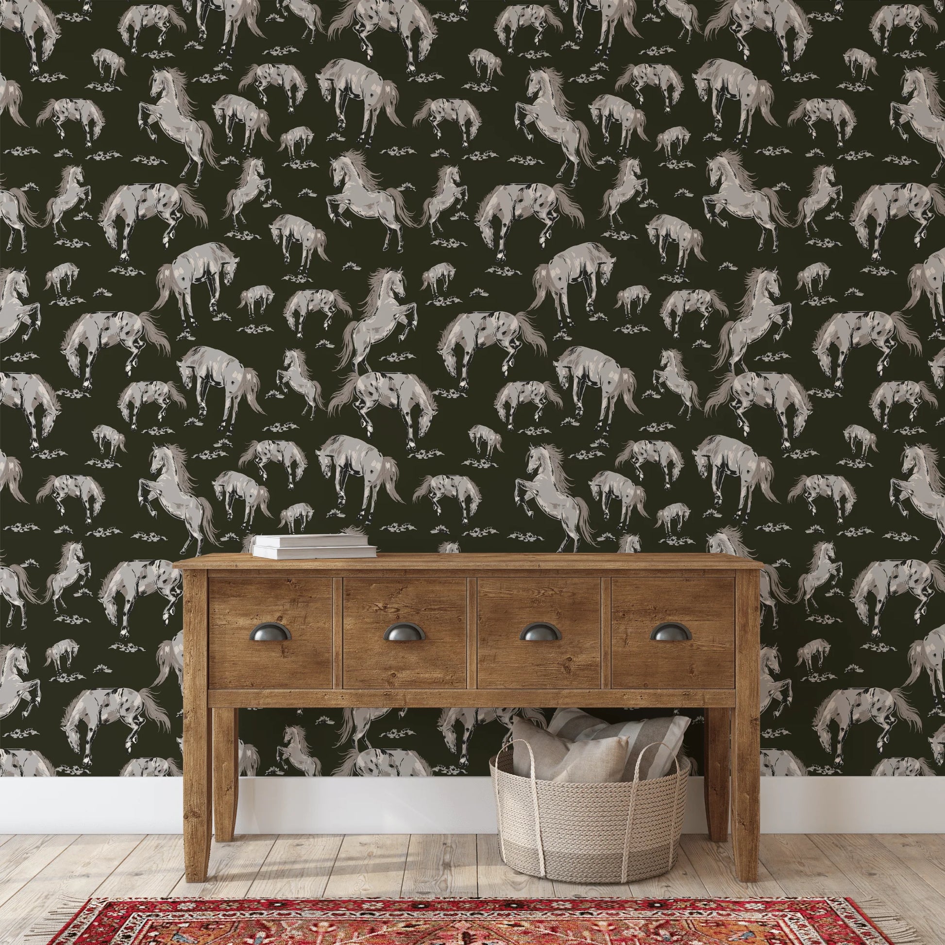 Transform your space with our Wild Stallion Wallpaper, a moody Western-style design that brings the spirit of untamed horses to your walls. This intricate pattern of this peel and stick removable wallpaper features elegant stallions in various poses, adds a touch of rustic charm and bold character to any room. Perfect for living spaces, entryways, or bedrooms, this wallpaper evokes the essence of the West with a modern twist.